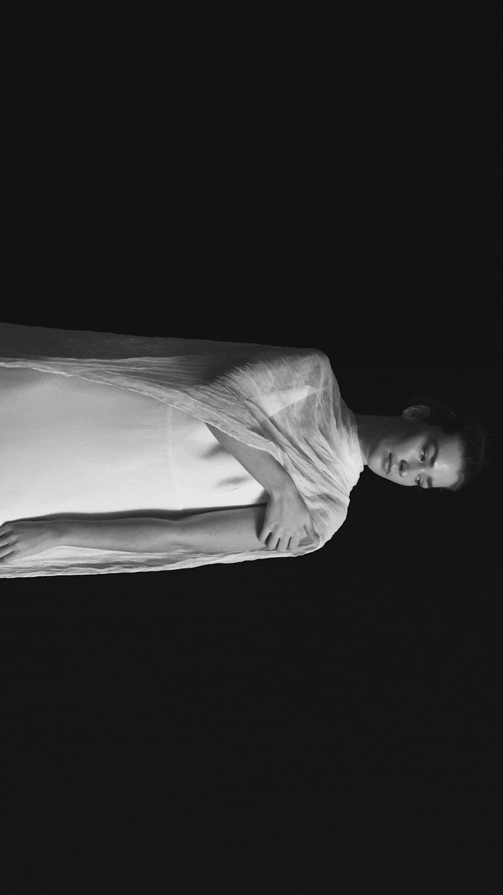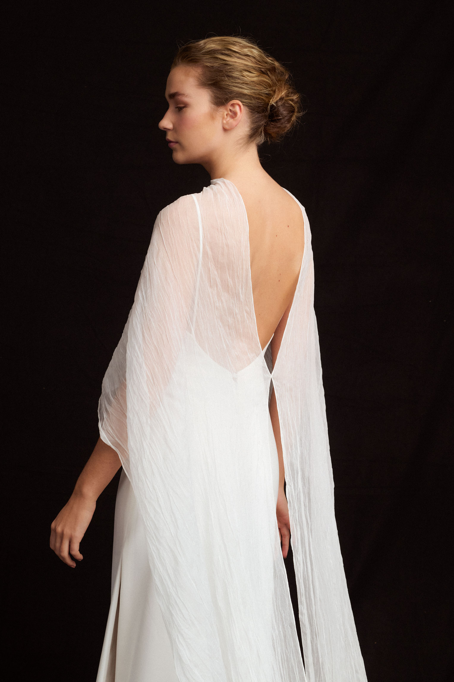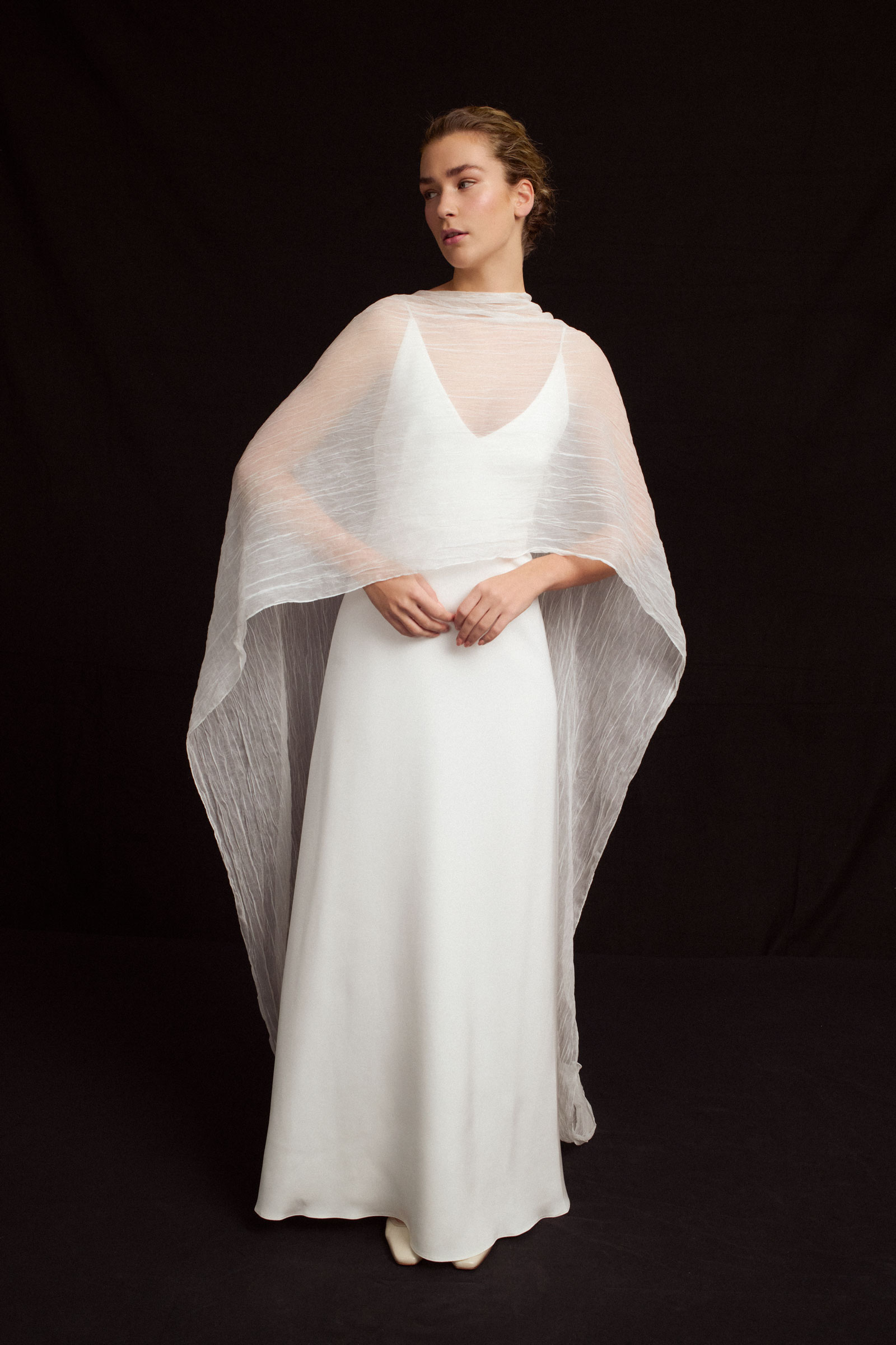 Devotion is an airy pleated silk cape that drapes across the front, resting gently over the shoulders and arms while leaving the back exposed. Paired with the Oh My God dress, a silk crepe column gown with a V neckline, spaghetti straps, and an open back.