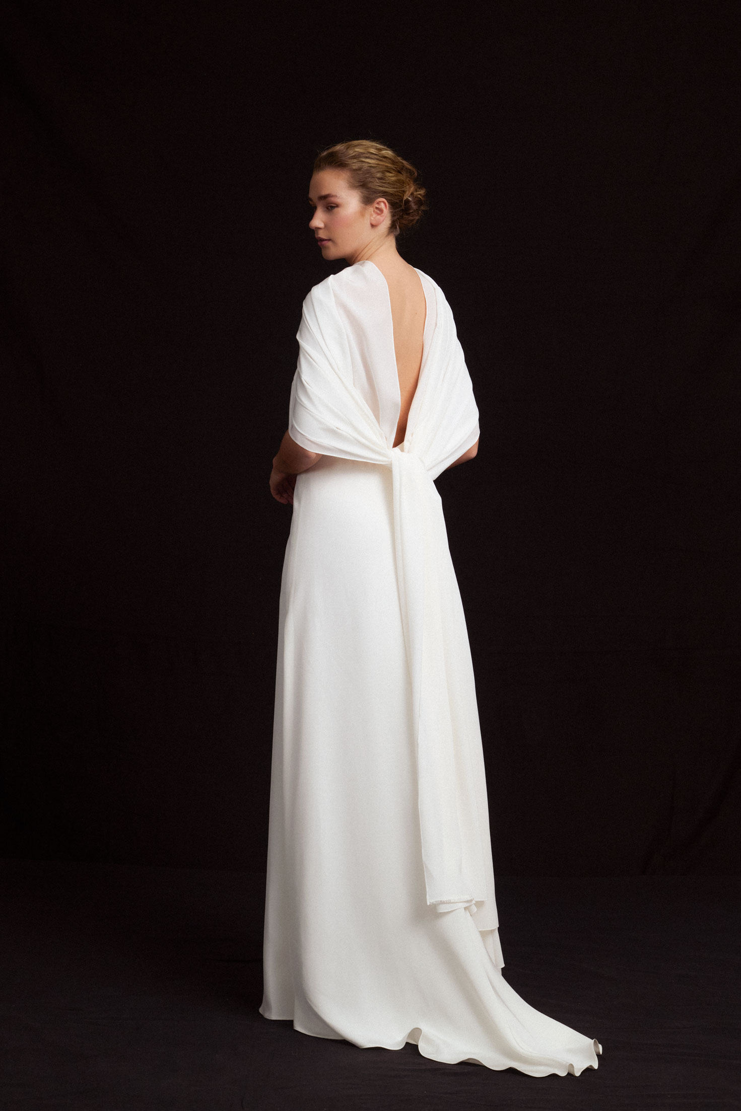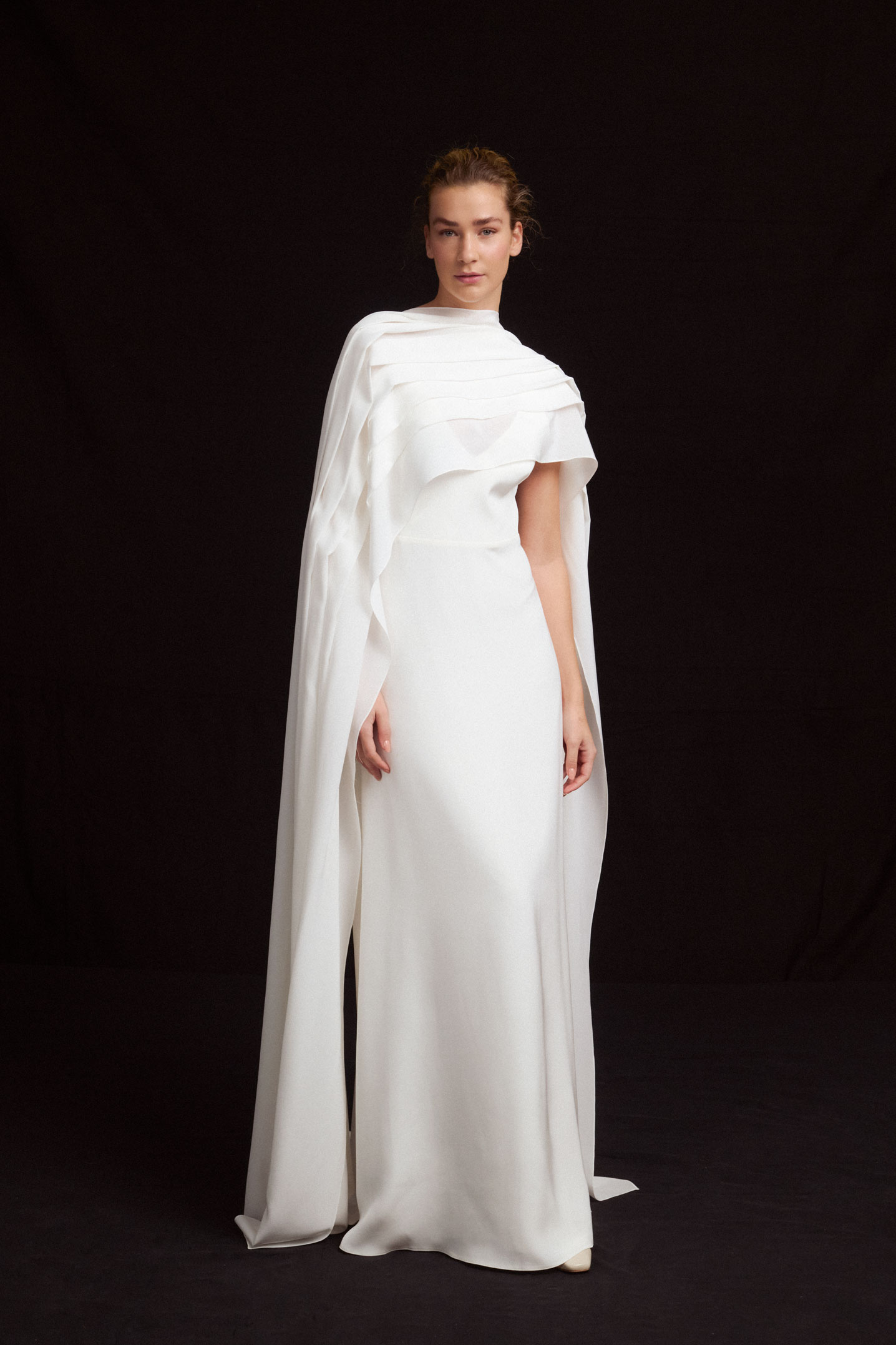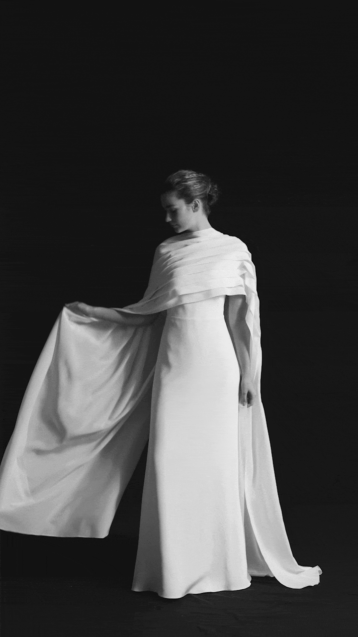 Eternity is a long silk crepe cape with pleats. It can be draped over the shoulders, wrapped around the neck, or tied at the back. Style it in your preferred way. Paired with the Oh My God dress, a silk crepe column gown with a V neckline, spaghetti straps, and an open back.