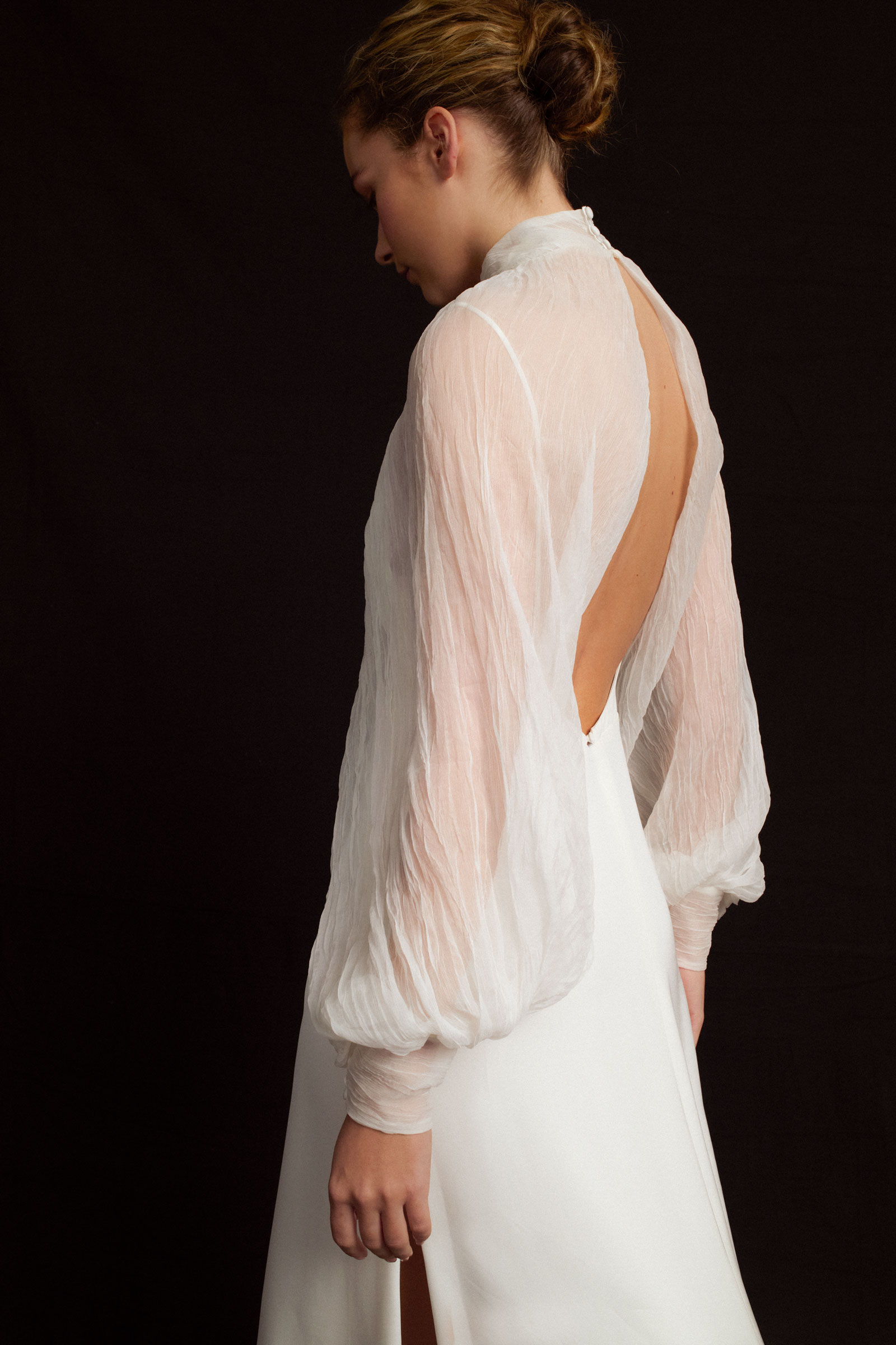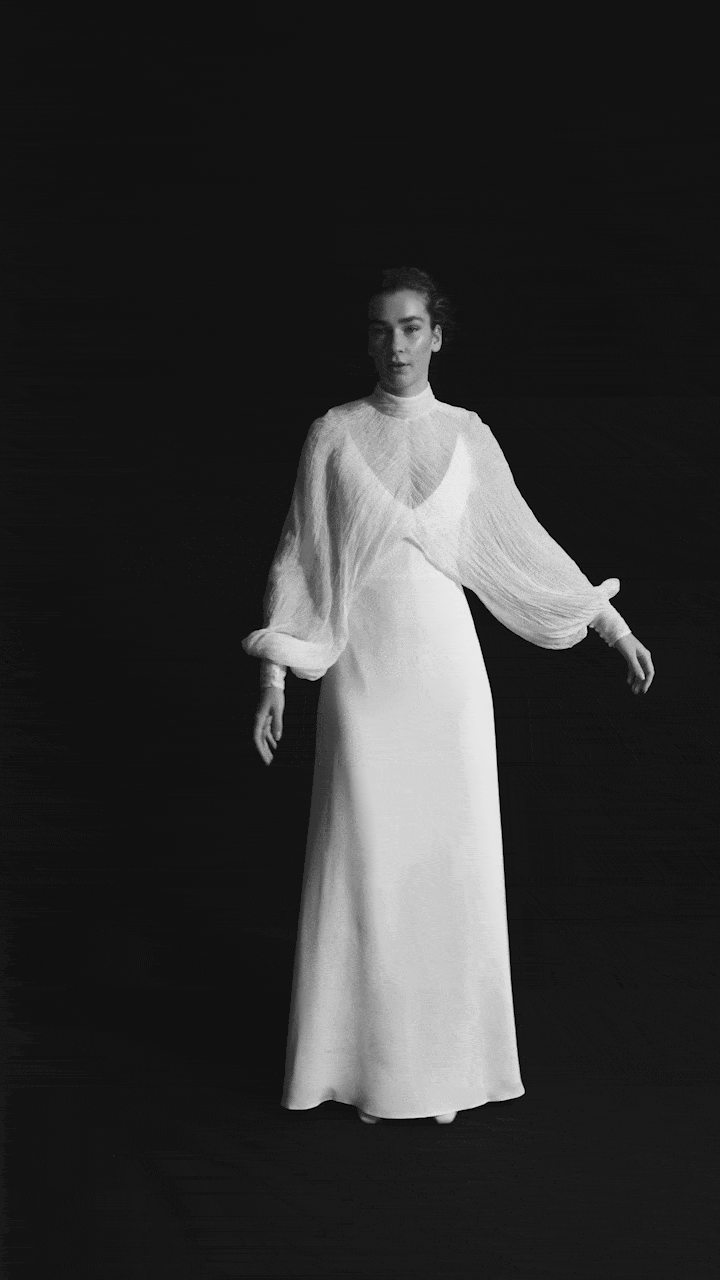 Evermore is a lightweight cape in pleated silk. It has a high neckline, an open back, and voluminous sleeves that taper into fitted cuffs with buttons. Paired with the Oh My God dress, a silk crepe column gown with a V neckline, spaghetti straps, and an open back.