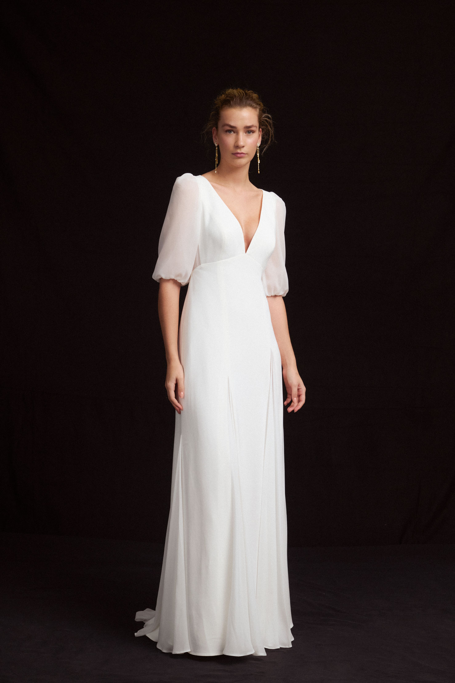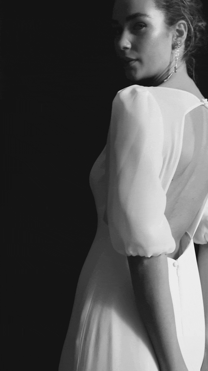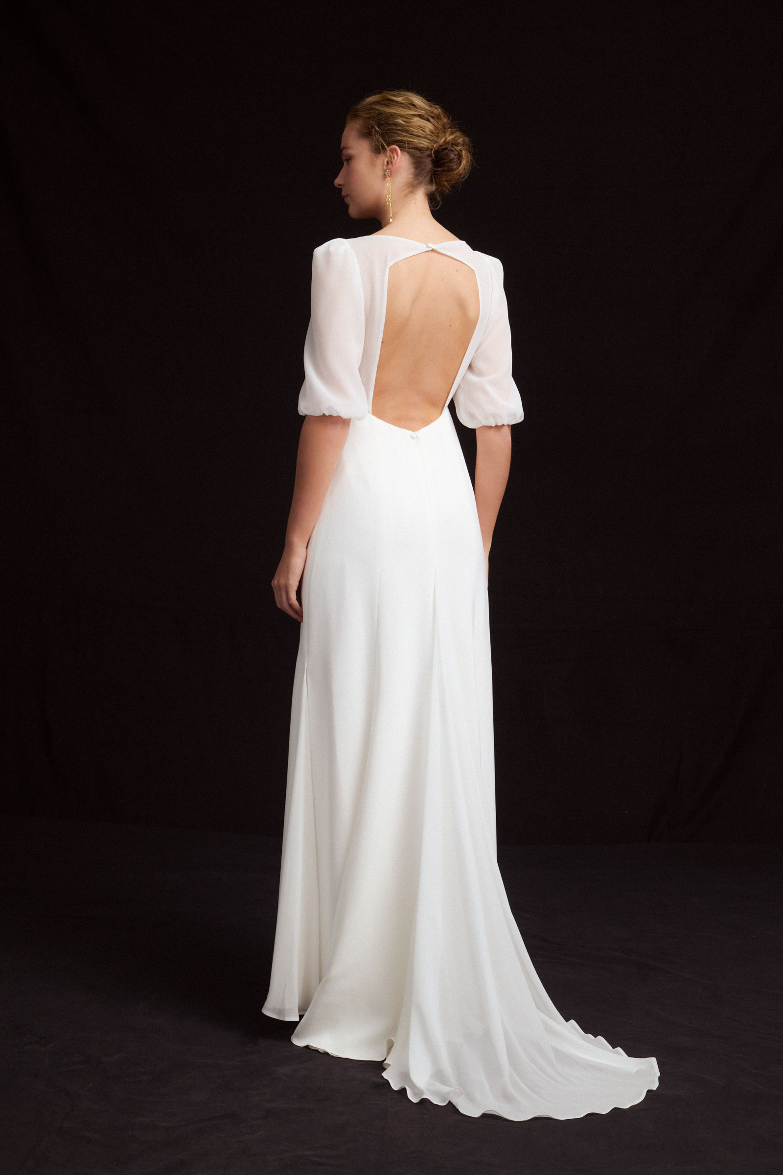 Minimalist charm in full silk. Paix is a crepe gown with a deep V neckline and an open back that closes at the top with a button. The elbow-length sleeves are made of soft chiffon. The skirt has light chiffon inserts at the front and on the sweep train.